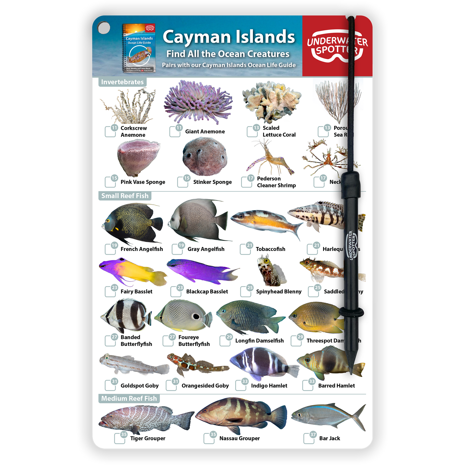 Bring this fully waterproof Cayman Islands Fish Identification Card with resin pencil on your next scuba or snorkel adventure and check off each animal you find!