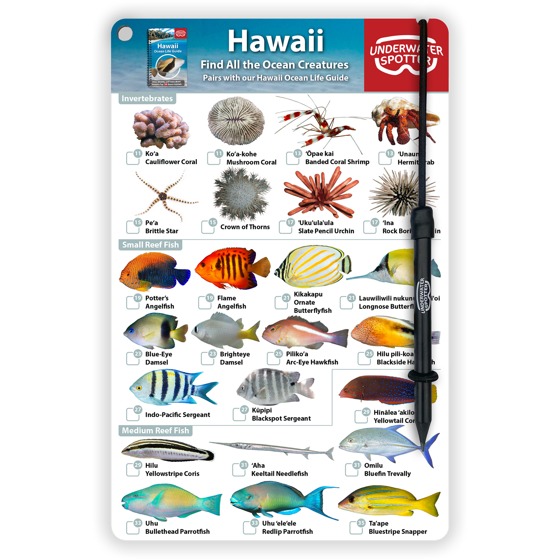 Bring this fully waterproof Hawaii Fish Identification Card with resin pencil on your next scuba or snorkel adventure and check off each animal you find!